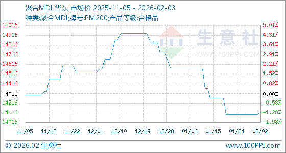 2月3日,生意社聚合MDI基准价为14133.33元/吨,与本月初(14100.00元/吨)相比,上涨了0.24%。