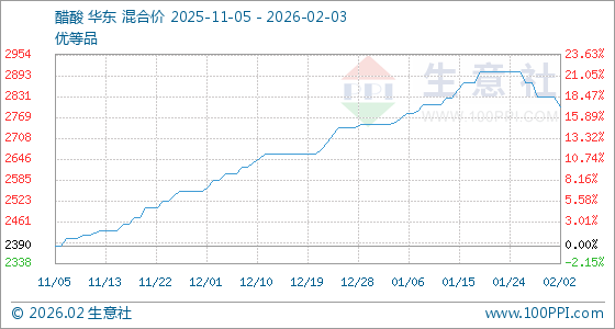 2月3日,生意社醋酸基准价为2800.00元/吨,与本月初(2830.00元/吨)相比,下降了1.06%。