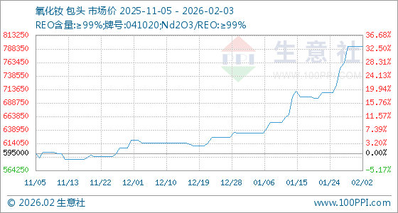 2月3日,生意社氧化钕基准价为792500.00元/吨,与本月初持平。