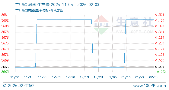 2月3日,生意社二甲醚基准价为3683.33元/吨,与本月初持平。