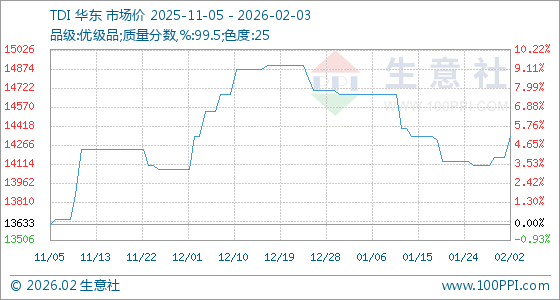 2月3日,生意社TDI基准价为14333.33元/吨,与本月初(14166.67元/吨)相比,上涨了1.18%。
