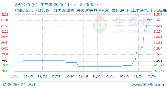 2月3日,生意社涤纶DTY基准价为8200.00元/吨,与本月初持平。