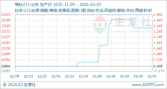 2月3日,生意社棉纱21S基准价为22200.00元/吨,与本月初持平。