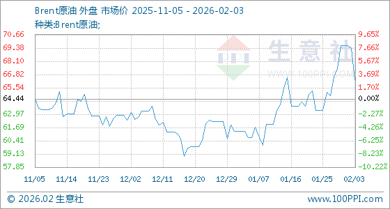 2月3日,生意社Brent原油基准价为69.32美元/桶,与本月初(69.59美元/桶)相比,下降了0.39%。
