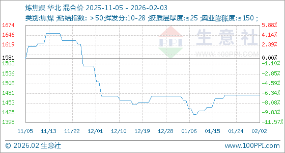 2月3日,生意社炼焦煤基准价为1476.25元/吨,与本月初持平。