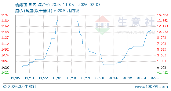 2月3日,生意社硫酸铵基准价为1153.33元/吨,与本月初持平。