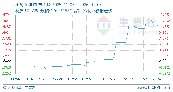 2月3日,生意社不锈钢基准价为14306.67元/吨,与本月初(14473.33元/吨)相比,下降了1.15%。