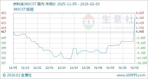 2月3日,生意社燃料油380CST基准价为445.00美元/吨,与本月初(398.50美元/吨)相比,上涨了11.67%。