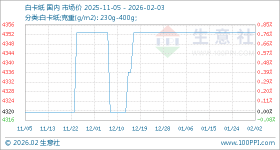 2月3日,生意社白卡纸基准价为4353.33元/吨,与本月初持平。
