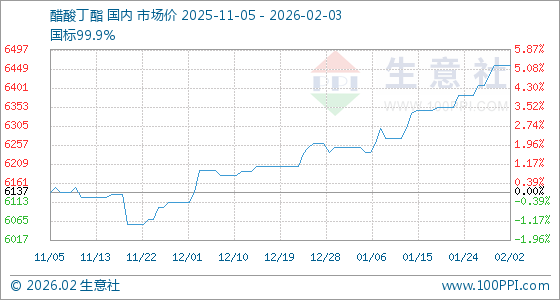 2月3日,生意社醋酸丁酯基准价为6457.50元/吨,与本月初持平。