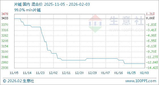2月3日,生意社片碱基准价为2983.33元/吨,与本月初持平。