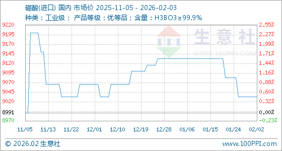 2月3日,生意社硼酸(进口)基准价为9033.33元/吨,与本月初持平。