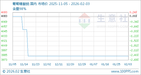 2月3日,生意社葡萄糖酸钠基准价为3983.33元/吨,与本月初持平。