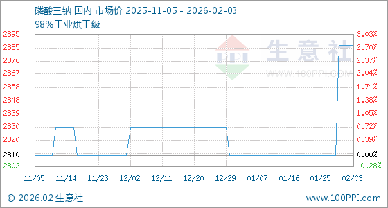 2月3日,生意社磷酸三钠基准价为2887.50元/吨,与本月初持平。