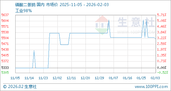2月3日,生意社磷酸二氢钠基准价为5510.00元/吨,与本月初持平。