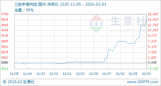 2月3日,生意社三羟甲基丙烷基准价为9430.00元/吨,与本月初持平。