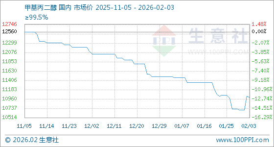 2月3日,生意社甲基丙二醇基准价为11020.00元/吨,与本月初(10700.00元/吨)相比,上涨了2.99%。