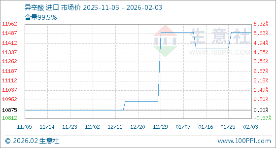 2月3日,生意社异辛酸基准价为11500.00元/吨,与本月初持平。