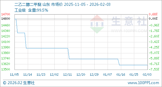 2月3日,生意社二乙二醇二甲醚基准价为13600.00元/吨,与本月初持平。