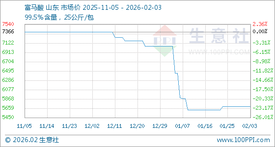 2月3日,生意社富马酸基准价为5700.00元/吨,与本月初持平。