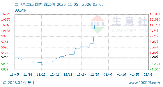 2月3日,生意社二甲基二硫基准价为10566.67元/吨,与本月初持平。