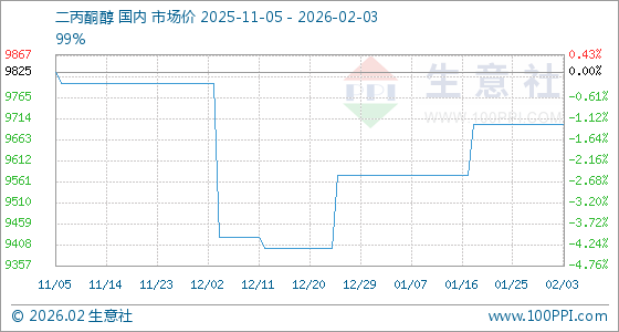 2月3日,生意社二丙酮醇基准价为9700.00元/吨,与本月初持平。