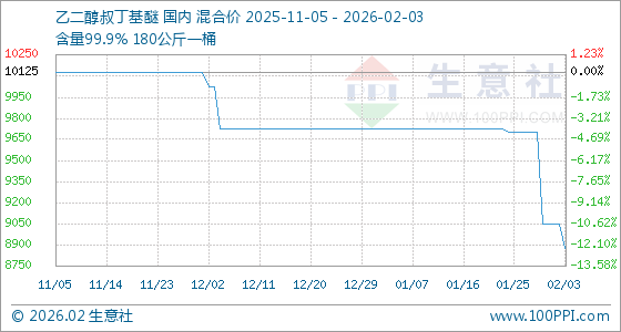 2月3日,生意社乙二醇叔丁基醚基准价为9050.00元/吨,与本月初持平。
