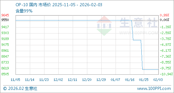 2月3日,生意社OP-10基准价为8600.00元/吨,与本月初持平。