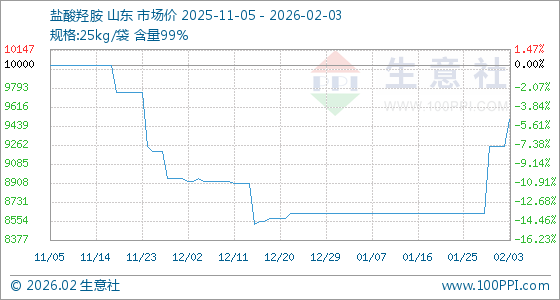 2月3日,生意社盐酸羟胺基准价为9250.00元/吨,与本月初持平。