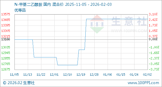 2月3日,生意社N-甲基二乙醇胺基准价为13500.00元/吨,与本月初持平。
