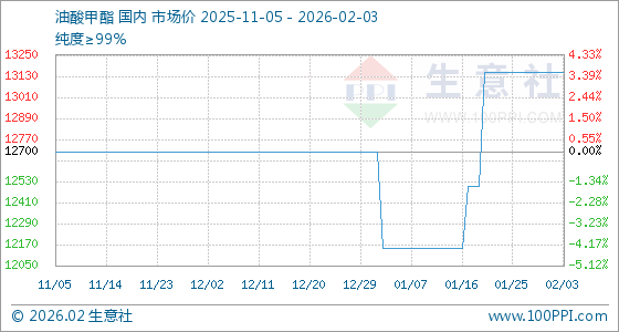 2月3日,生意社油酸甲酯基准价为13150.00元/吨,与本月初持平。