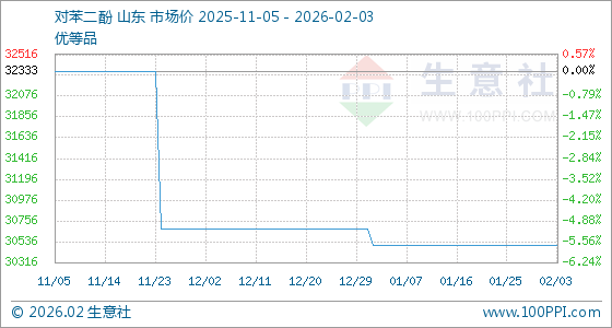 2月3日,生意社对苯二酚基准价为30500.00元/吨,与本月初持平。