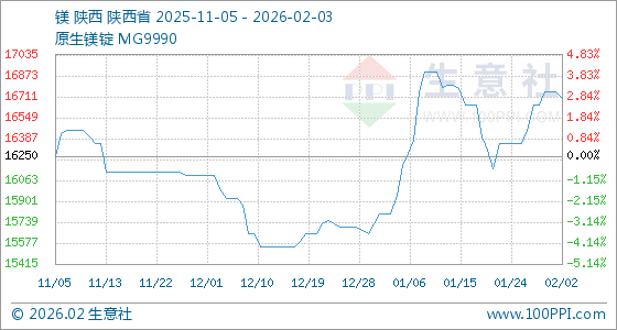 2月3日,生意社镁基准价为16700.00元/吨,与本月初(16750.00元/吨)相比,下降了0.3%。