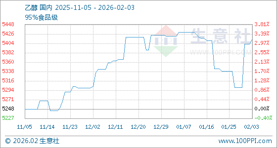 2月3日,生意社乙醇基准价为5403.33元/吨,与本月初持平。
