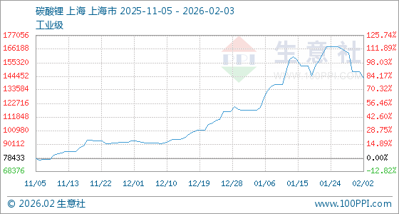 2月3日,生意社碳酸锂(工业级)基准价为143000.00元/吨,与本月初(148000.00元/吨)相比,下降了3.38%。