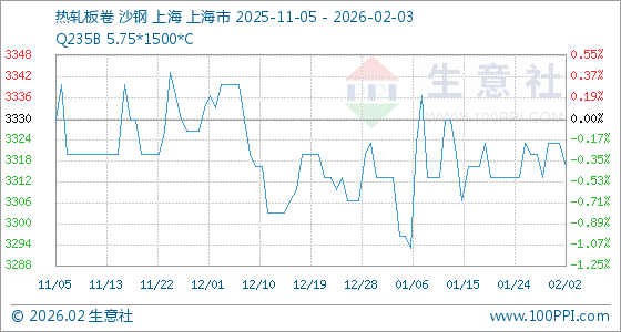 2月3日,生意社热轧板卷基准价为3316.67元/吨,与本月初(3323.33元/吨)相比,下降了0.2%。