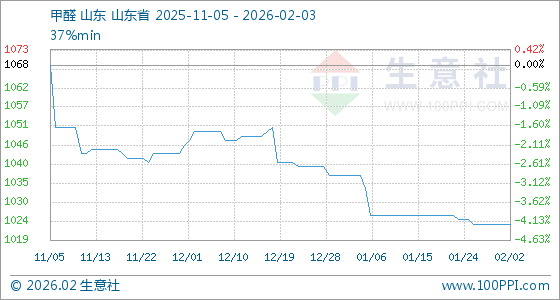 2月3日,生意社甲醛基准价为1023.75元/吨,与本月初持平。
