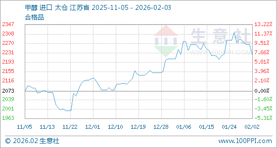 2月3日,生意社甲醇基准价为2223.33元/吨,与本月初(2265.00元/吨)相比,下降了1.84%。