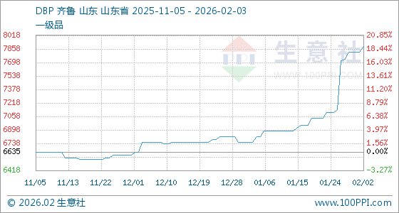 2月3日,生意社DBP基准价为7885.00元/吨,与本月初(7818.33元/吨)相比,上涨了0.85%。
