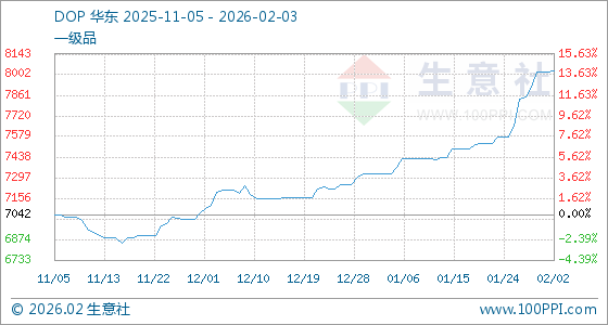 2月3日,生意社DOP基准价为8025.84元/吨,与本月初(8017.50元/吨)相比,上涨了0.10%。