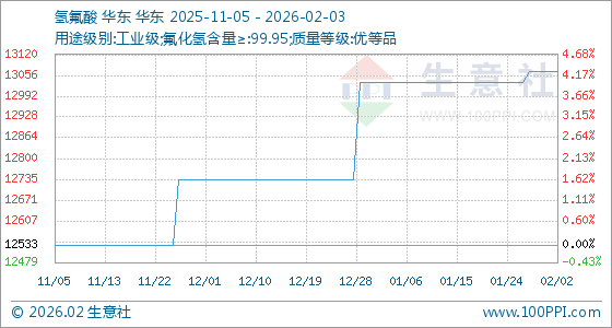 2月3日,生意社氢氟酸基准价为13066.67元/吨,与本月初持平。