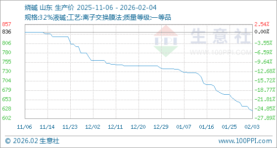 2月4日,生意社烧碱基准价为624.00元/吨,与本月初(636.00元/吨)相比,下降了1.89%。