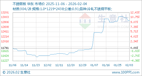 2月4日,生意社不锈钢板基准价为12875.00元/吨,与本月初(12991.67元/吨)相比,下降了0.9%。