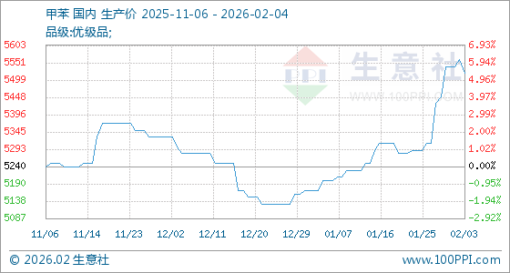 2月4日,生意社甲苯基准价为5520.00元/吨,与本月初(5540.00元/吨)相比,下降了0.36%。
