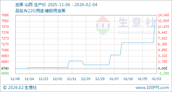 2月4日,生意社炭黑基准价为7600.00元/吨,与本月初(7200.00元/吨)相比,上涨了5.56%。