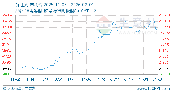 2月4日,生意社铜基准价为101388.33元/吨,与本月初(104496.67元/吨)相比,下降了2.97%。
