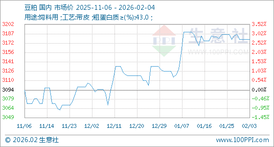 2月4日,生意社豆粕基准价为3178.00元/吨,与本月初持平。