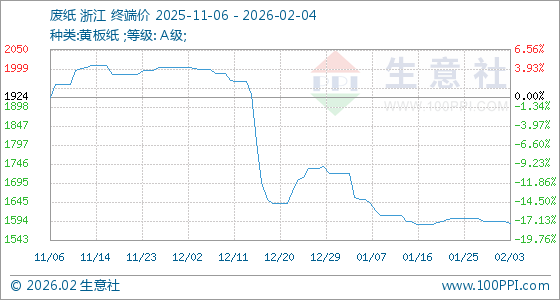 2月4日,生意社废纸基准价为1588.00元/吨,与本月初(1592.00元/吨)相比,下降了0.25%。