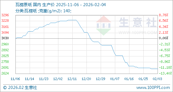 2月4日,生意社瓦楞原纸基准价为2680.00元/吨,与本月初持平。