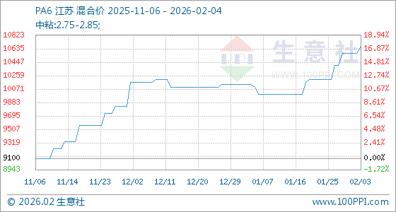 2月4日,生意社PA6基准价为10666.67元/吨,与本月初(10566.67元/吨)相比,上涨了0.95%。